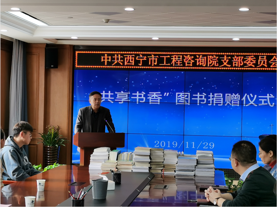 為提升全院職工文化素養(yǎng),努力營(yíng)造濃郁的讀書(shū)學(xué)習(xí)氛圍,2019年11月29日下午在西寧市工程咨詢?cè)?0樓會(huì)議室舉行以“共享書(shū)香”為主題的圖書(shū)捐贈(zèng)儀式。西寧市工程咨詢?cè)侯檰?wèn)李勇、院長(zhǎng)李廷君、副院長(zhǎng)蘇星、副院長(zhǎng)羅文芳及全體職工出席活動(dòng)。由西寧市工程咨詢?cè)侯檰?wèn)李勇老師向咨詢?cè)壕栀?zèng)圖書(shū)200余冊(cè),包括宏觀經(jīng)濟(jì)學(xué)、經(jīng)濟(jì)研究類等方面的圖書(shū)。
