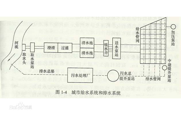 給水工程為居民和廠、礦、運輸企業(yè)供應(yīng)生活、生產(chǎn)用水的工程以及消防用水、道路綠化用水等。由給水水源、取水構(gòu)筑物、原水管道、給水處理廠和給水管網(wǎng)組成,具有取集和輸送原水、改善水質(zhì)的作用。① 給水水源有地表水、地下水和再用水。②取水構(gòu)筑物有地表水取水構(gòu)筑物和地下水取水。